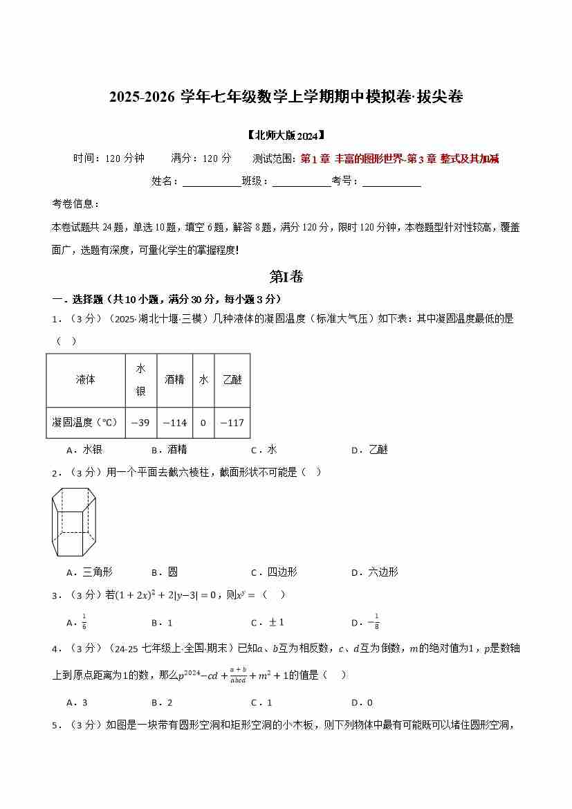 七年级数学上学期期中模拟卷·拔尖卷(北师大版2024,举一反三)(学生版)