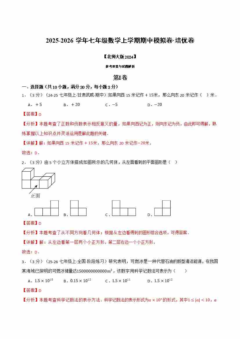 七年级数学上学期期中模拟卷·培优卷(北师大版2024,举一反三)(教师版)