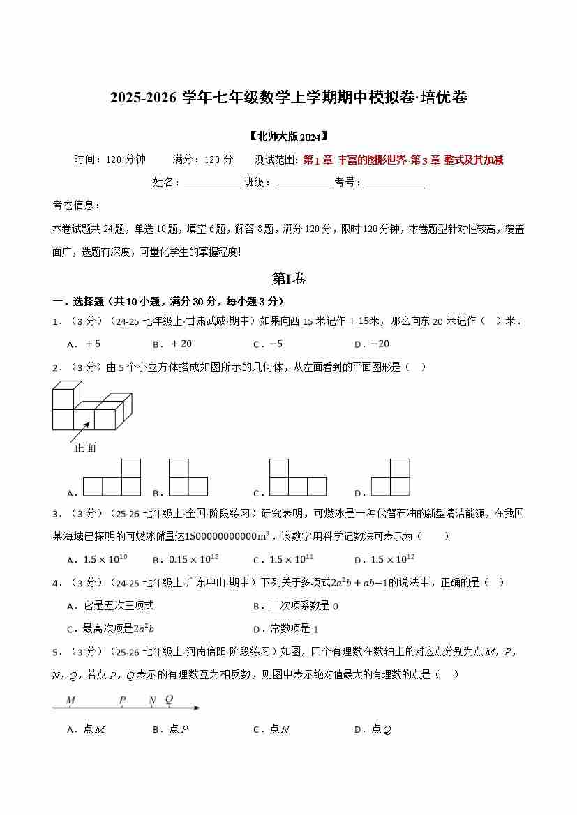 七年级数学上学期期中模拟卷·培优卷(北师大版2024,举一反三)(学生版)