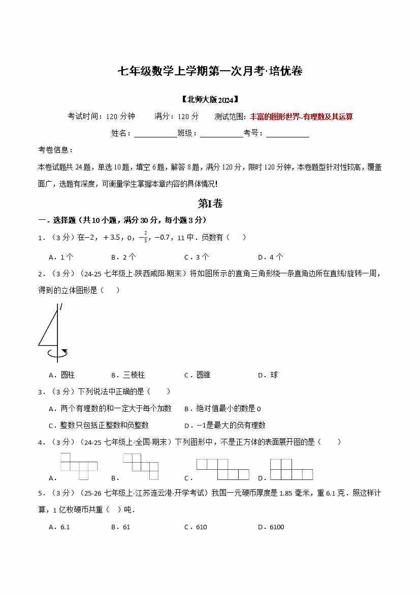 七年级数学上学期第一次月考·培优卷(北师大版2024,举一反三)(学生版)