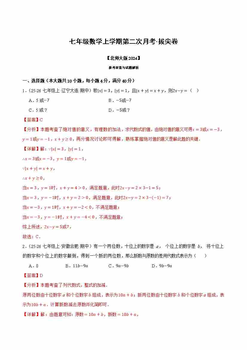 首页 > 全部 > 第三次月考 > 七年级数学上学期第二次月考·拔尖卷(北师大版2024,举一反三,测试范围:第1章 丰富的图形世界~第5章 一元一次方程)(教师版)
