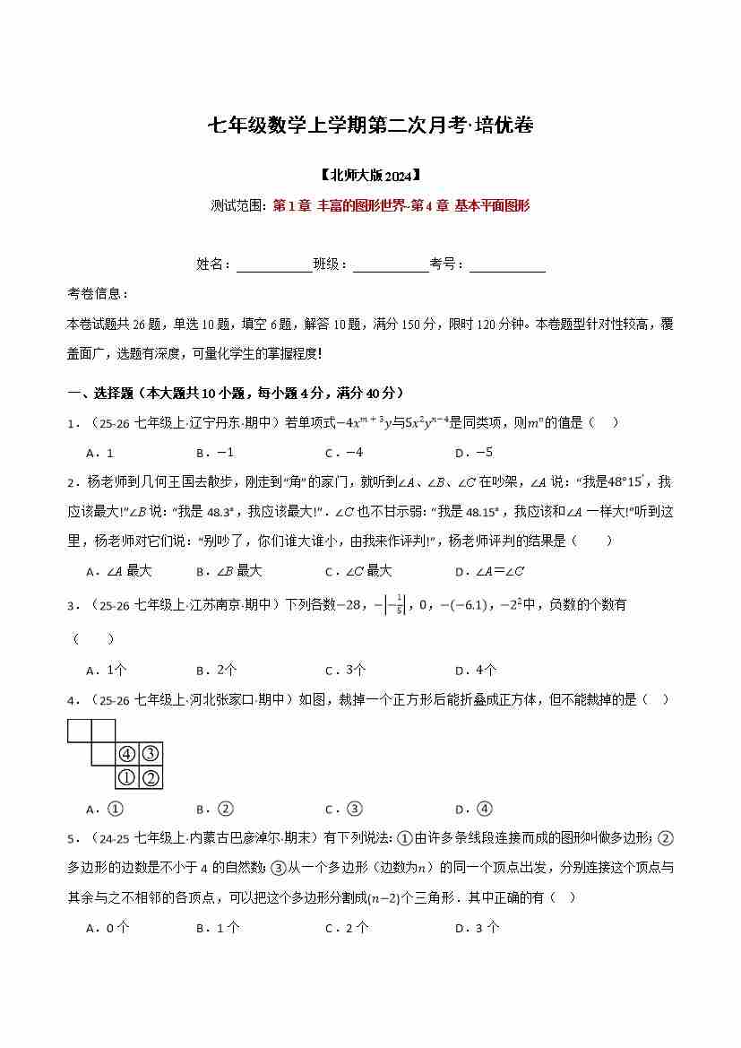 首页 > 全部 > 第三次月考 > 七年级数学上学期第二次月考·培优卷(北师大版2024,举一反三,测试范围:第1章 丰富的图形世界~第4章 基本平面图形)(学生版)