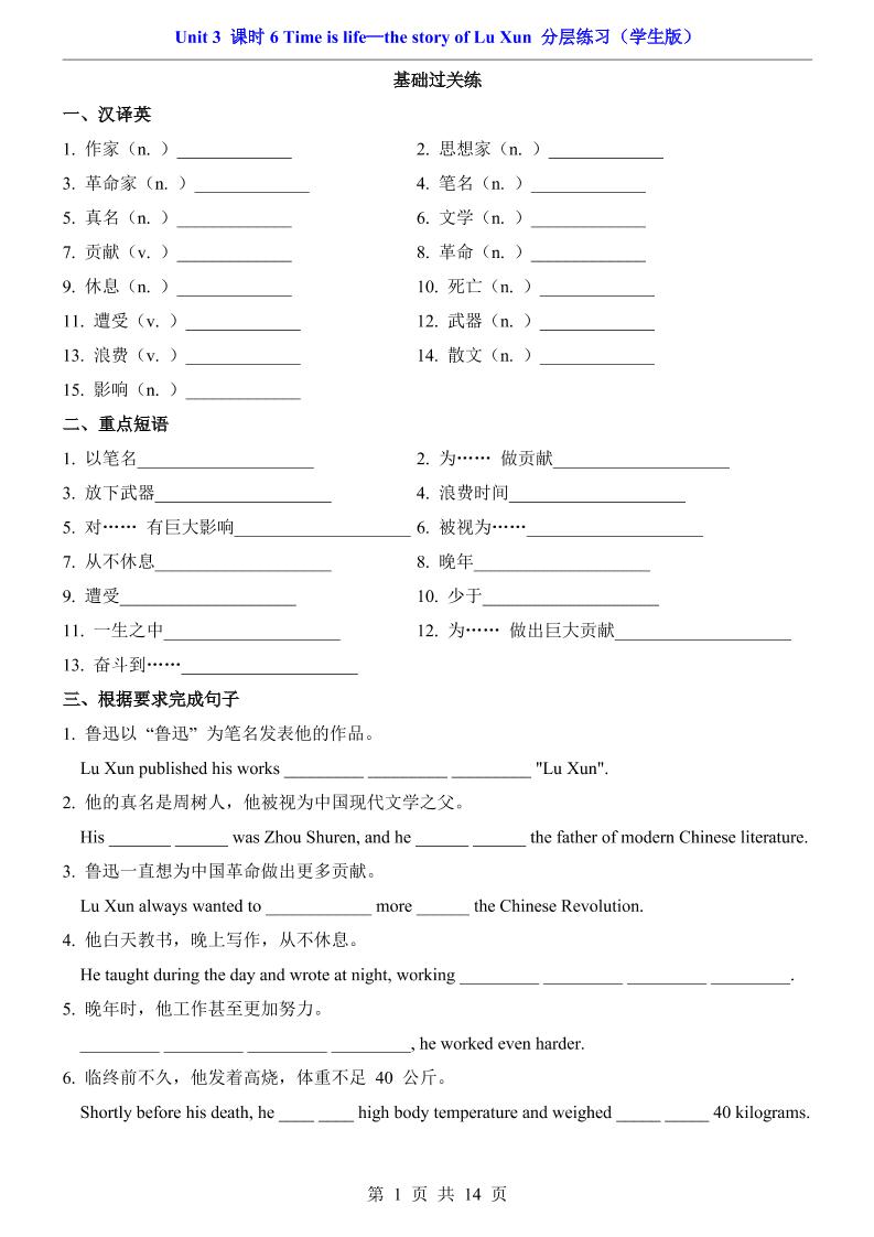 首页 > 全部 > 一课一练 > Unit 3 课时6 Time is life—the story of Lu Xun(分层练习)1
