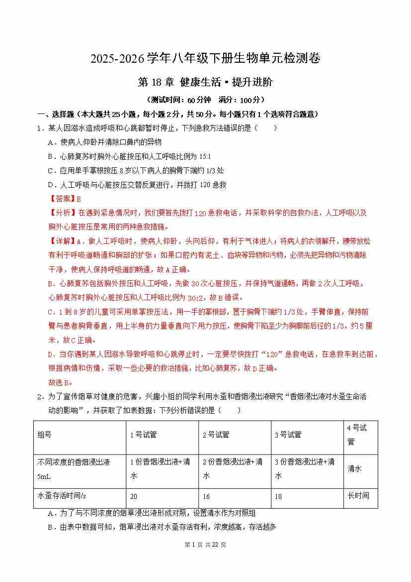 首页 > 全部 > 单元提升卷 > 第18章 健康生活(单元测试·提升卷)(解析版)