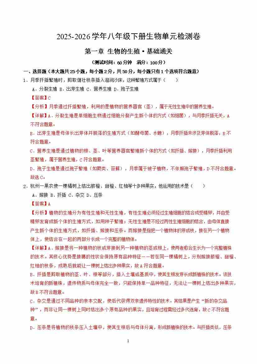 第六单元第一章 生物的生殖(单元测试·基础卷)(解析版)