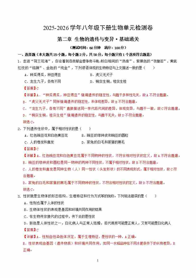 首页 > 全部 > 单元基础卷 > 第六单元第二章 生物的遗传与变异(单元测试·基础卷)(解析版)
