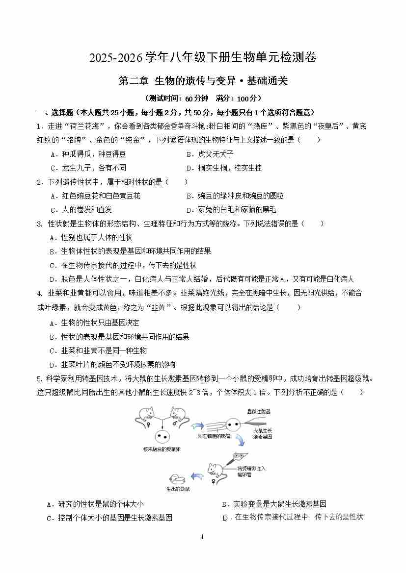 首页 > 全部 > 单元基础卷 > 第六单元第二章 生物的遗传与变异(单元测试·基础卷)(考试版A4)