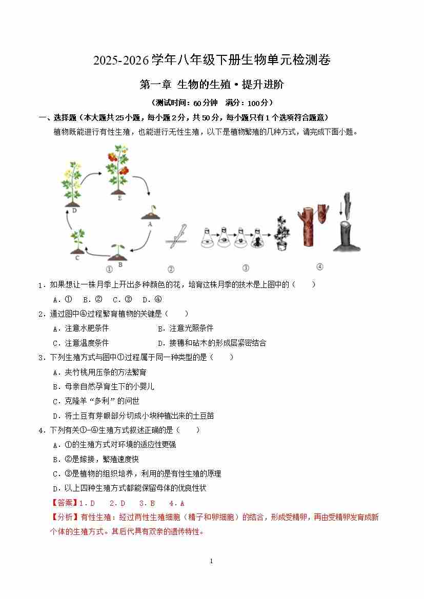首页 > 全部 > 单元提升卷 > 第六单元第一章 生物的生殖(单元测试·提升卷)(解析版)