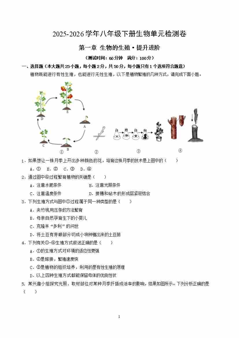 首页 > 全部 > 单元提升卷 > 第六单元第一章 生物的生殖(单元测试·提升卷)(考试版A4)