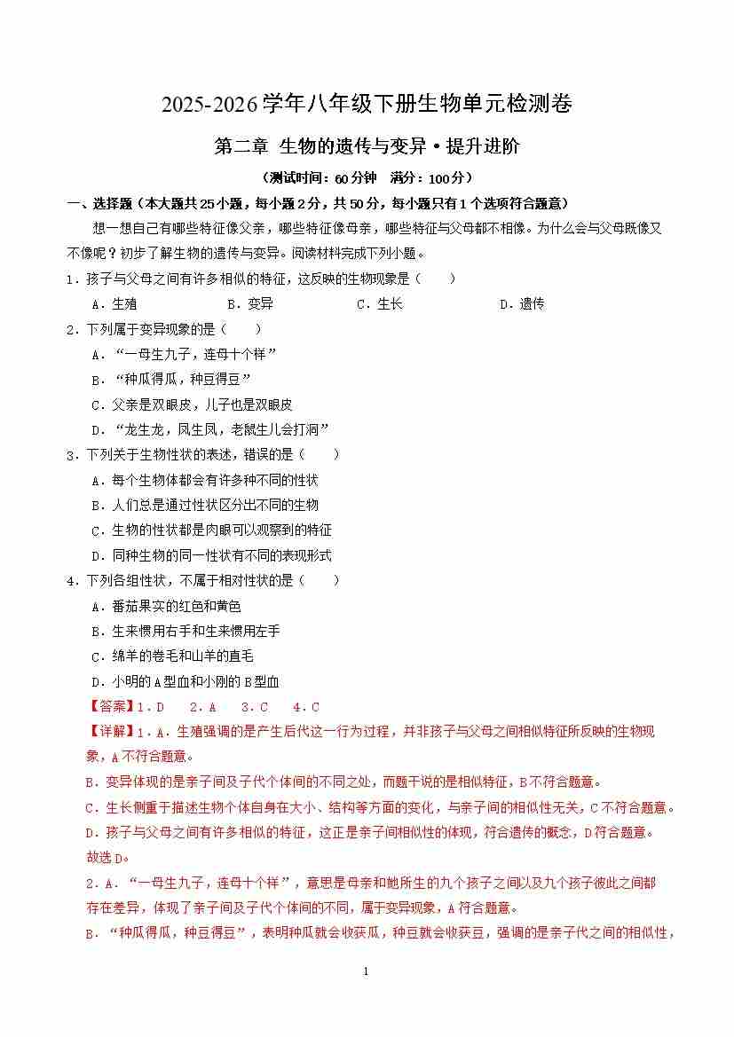 第六单元第二章 生物的遗传与变异(单元测试·提升卷)(解析版)