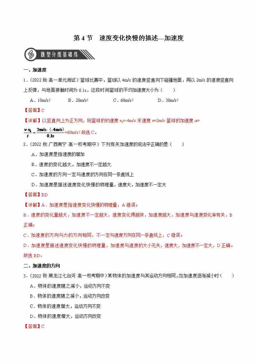 1.4 速度变化快慢的描述—加速度(分层作业)(解析版)-人教版2019必修第一册)