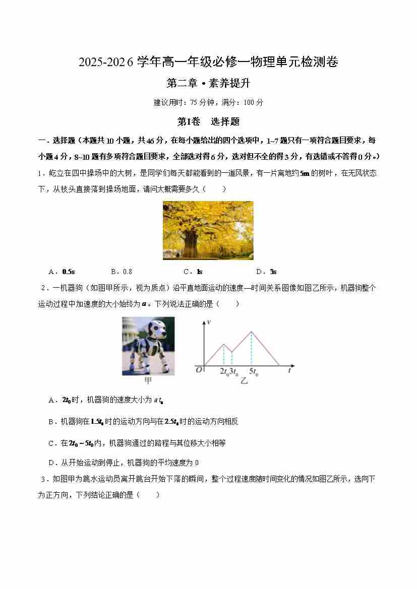 高一上物理第二章 单元测试·提升卷(考试版A4)