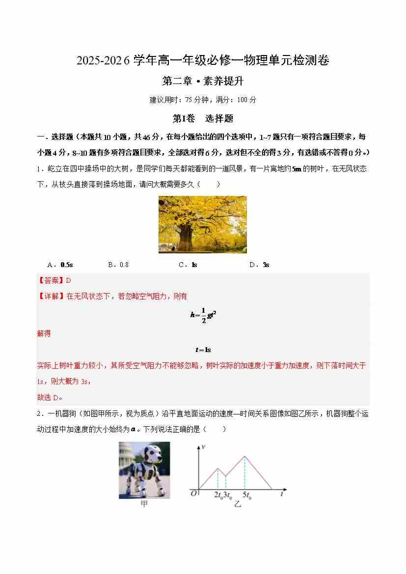 首页 > 全部 > 单元测试 > 高一上物理第二章 单元测试·提升卷(教师版)