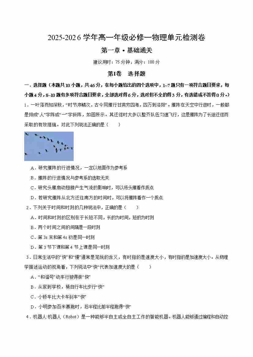 高一上物理第一章 单元测试·基础卷(考试版A4)
