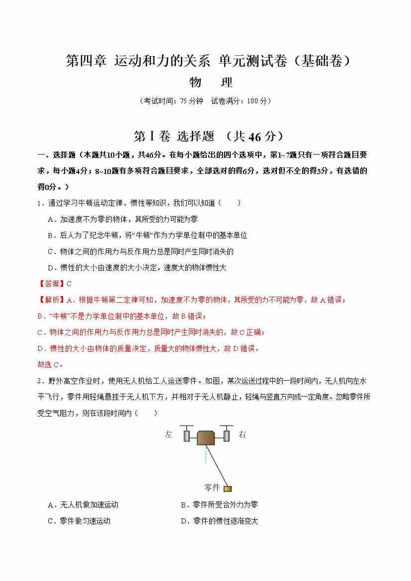 首页 > 全部 > 举一反三 > 第四章 运动和力的关系(举一反三单元测试·基础卷)(教师版)