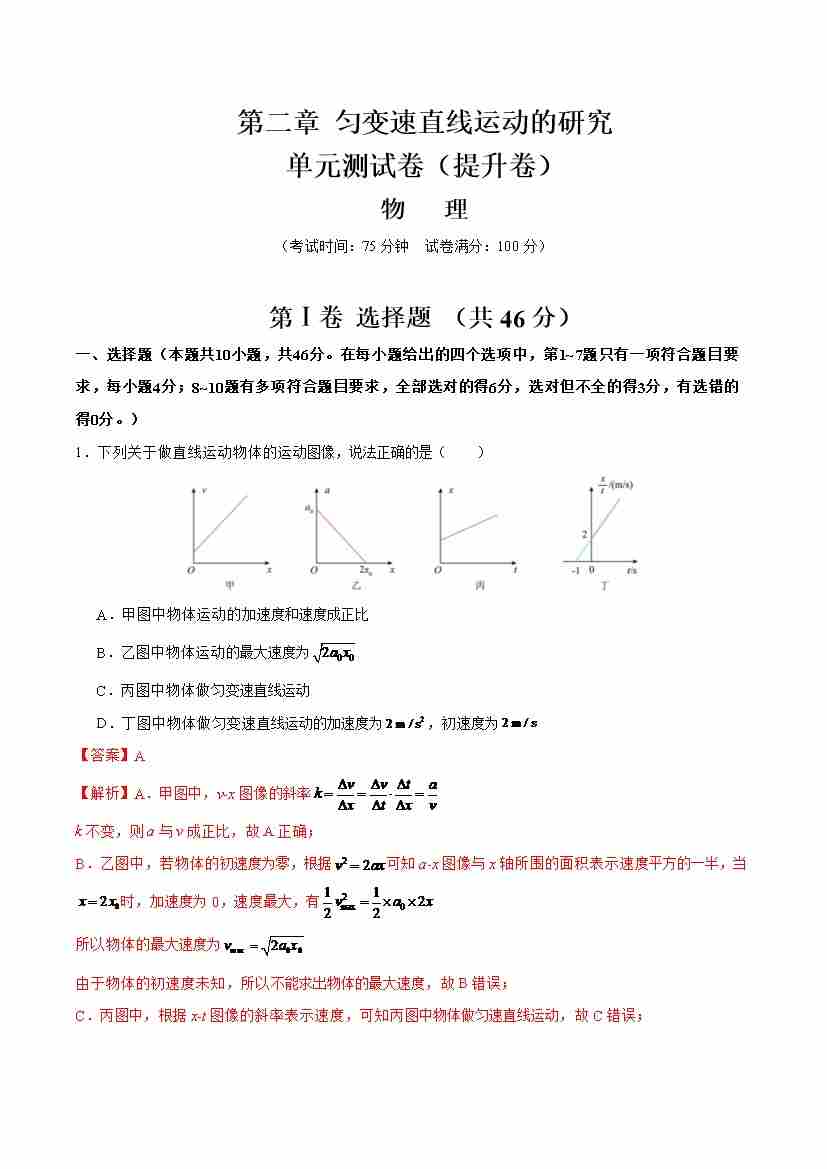 首页 > 全部 > 举一反三 > 第二章 匀变速直线运动的研究(举一反三单元测试·提升卷)(教师版)