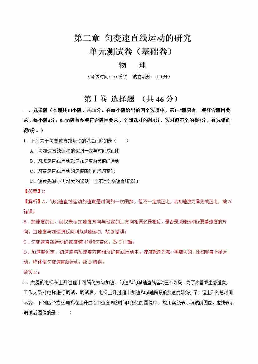 首页 > 全部 > 举一反三 > 第二章 匀变速直线运动的研究(举一反三单元测试·基础卷)(教师版)