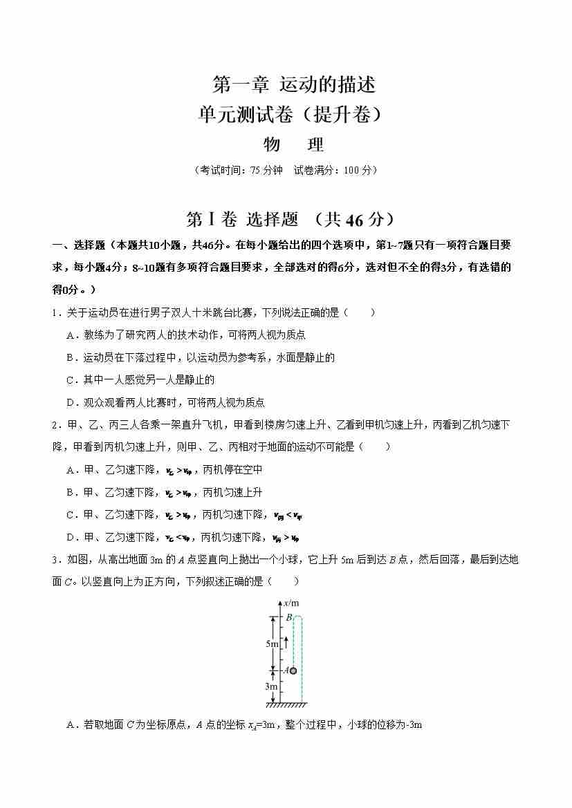 第一章 运动的描述(举一反三单元测试·提升卷)(学生版)