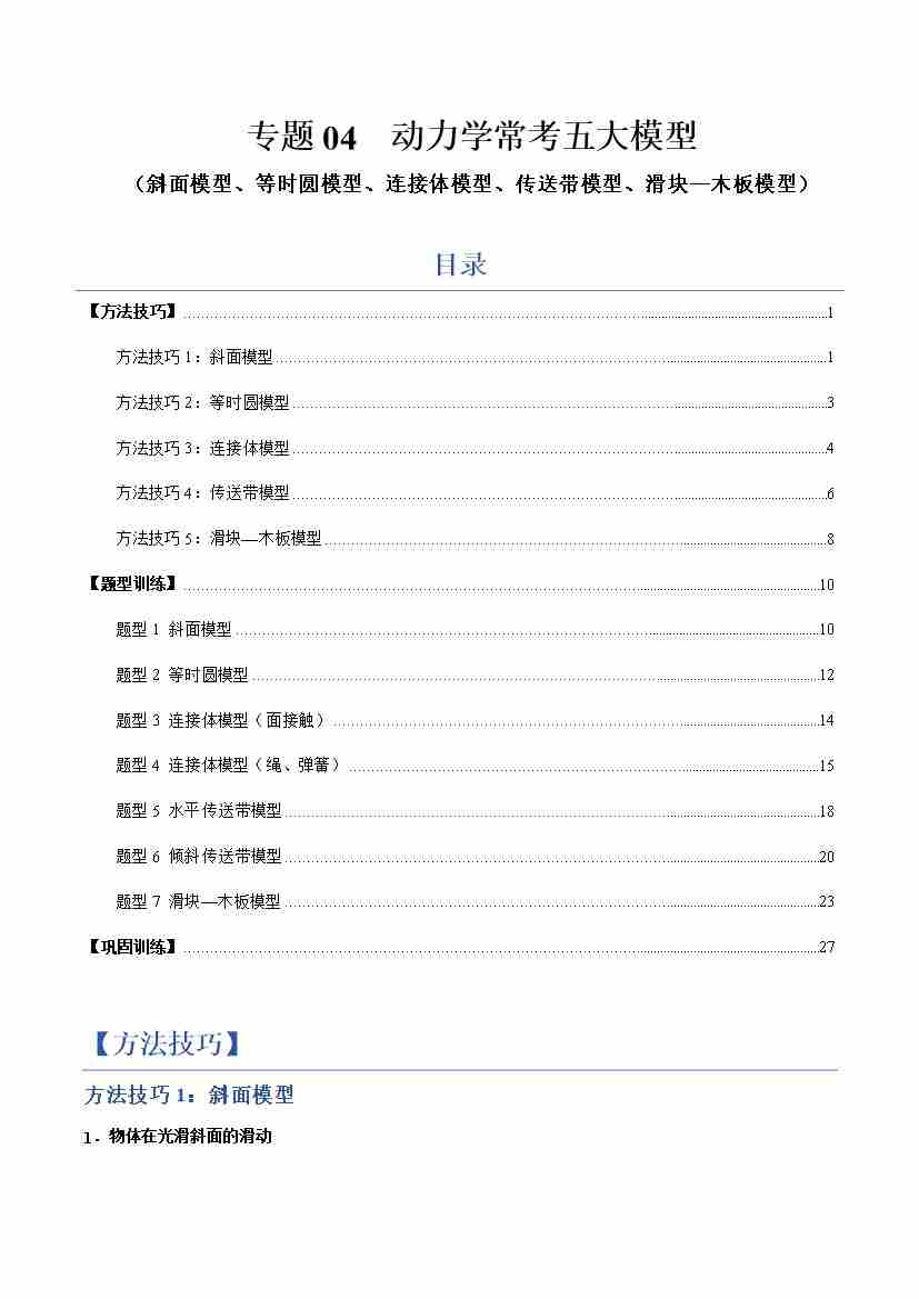 首页 > 全部 > 举一反三 > 专题04 动力学常考五大模型——斜面模型、等时圆模型、连接体模型、传送带模型、滑块-木板模型(举一反三专项训练)(学生版)