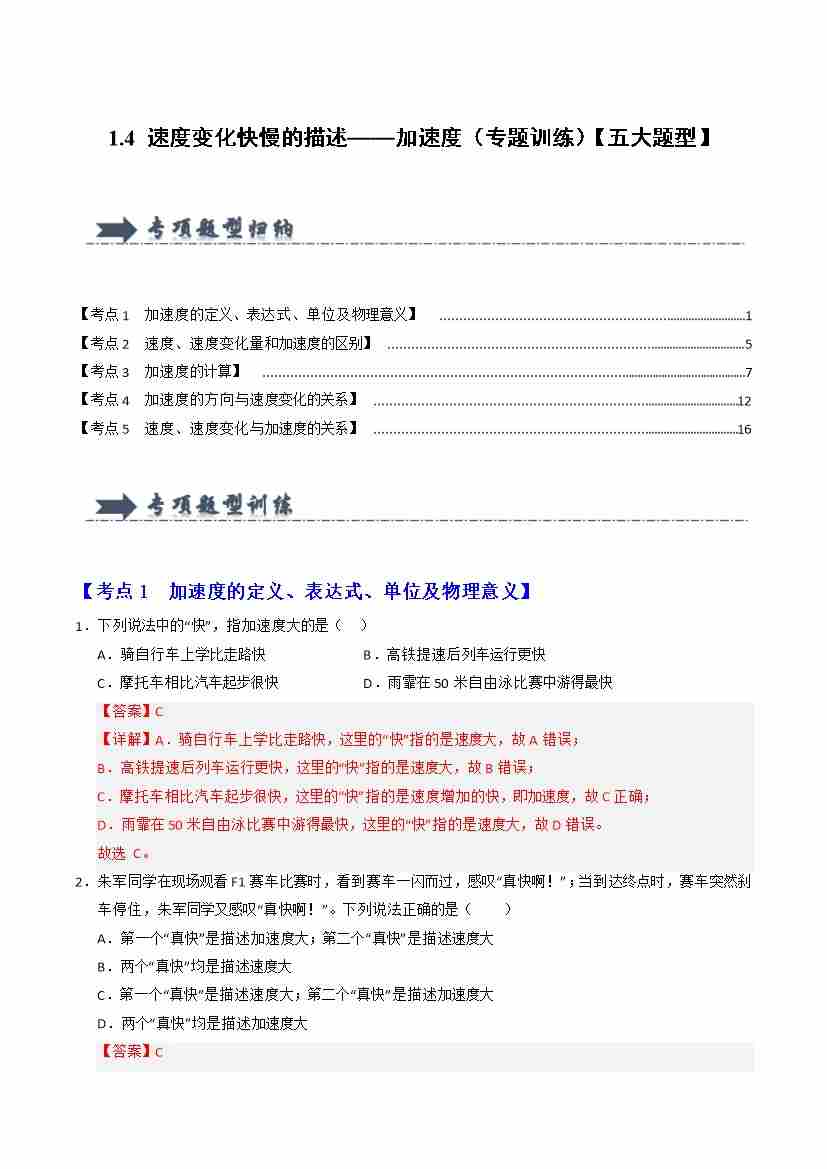 首页 > 全部 > 专题训练 > 1.4 速度变化快慢的描述——加速度(专题训练)(五大题型)(教师版)