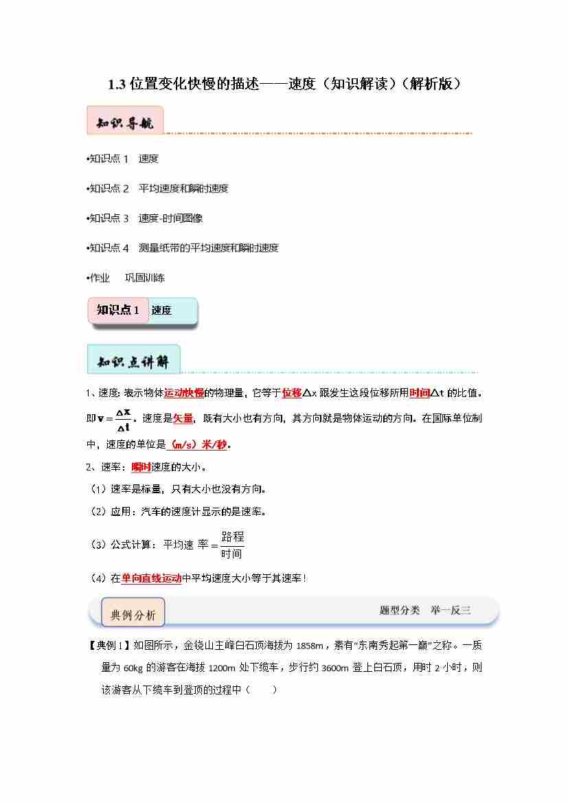 首页 > 全部 > 知识解读 > 1.3位置变化快慢的描述——速度(知识解读)(教师版)