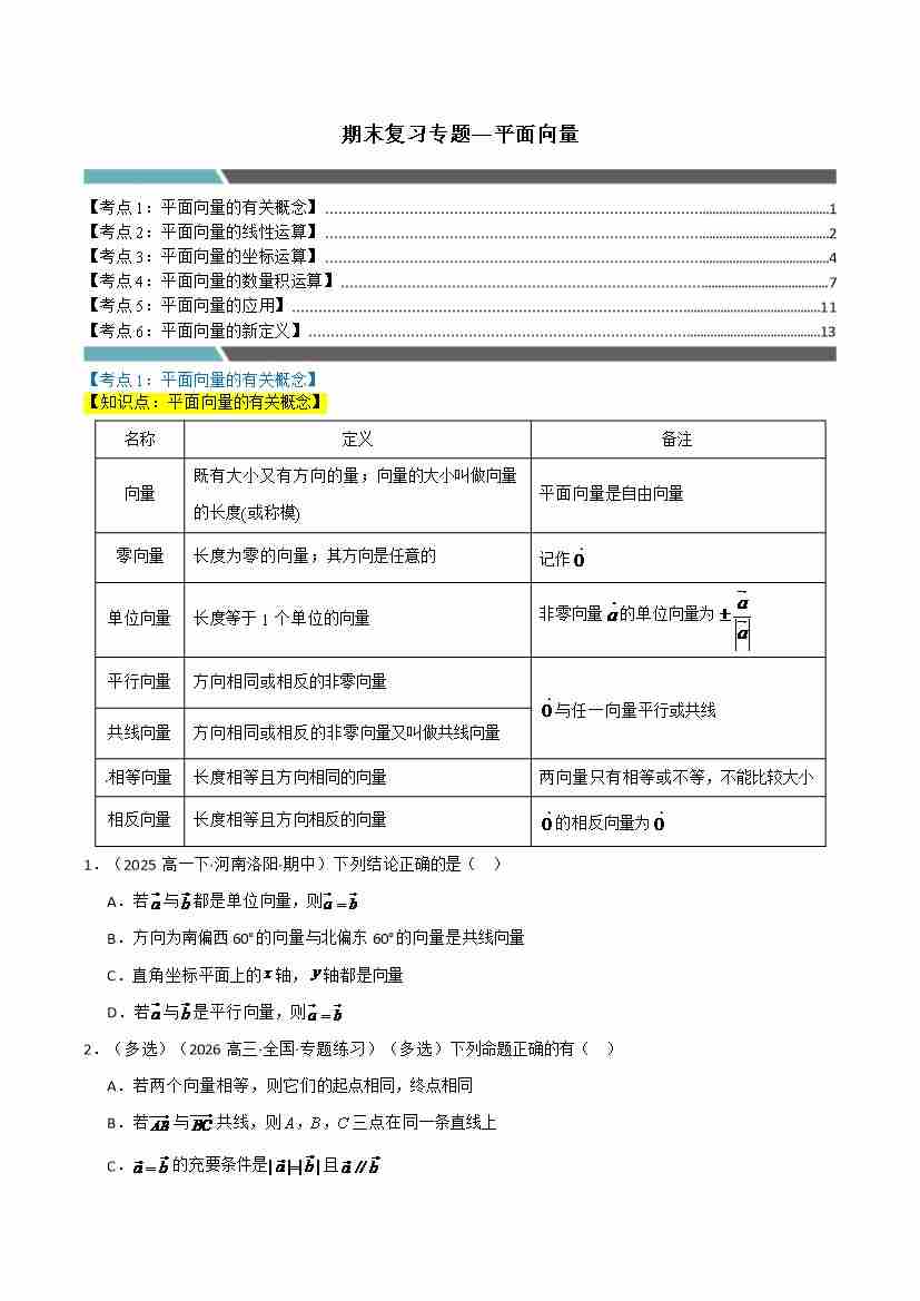 首页 > 全部 > 期末专项 > 期末复习专题— 平面向量(6类大考点)(人教A版2019必修第二册)(学生版)
