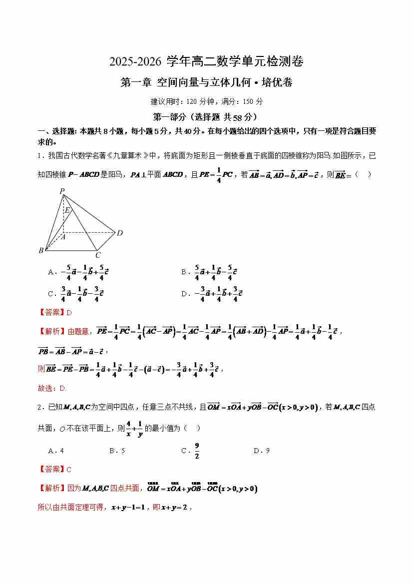 高二上数学第一章 空间向量与立体几何·培优卷(教师版)