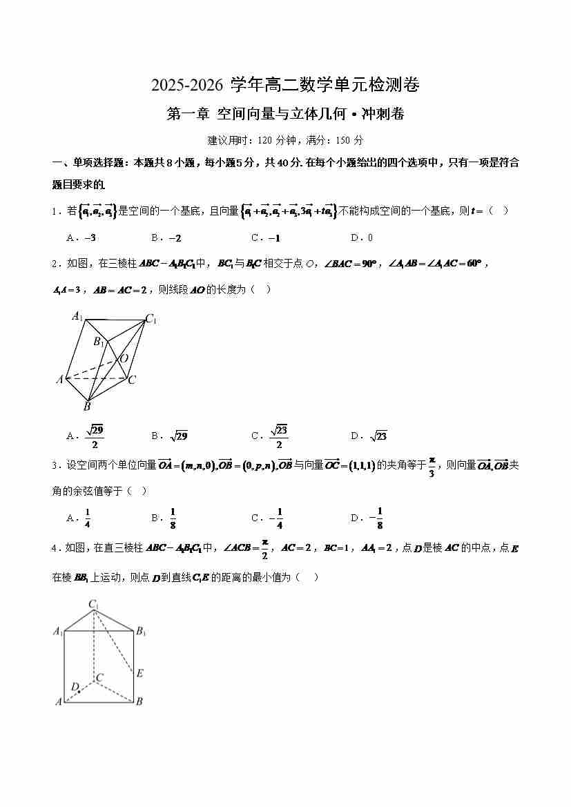 首页 > 全部 > 单元提升卷 > 高二上数学第一章 空间向量与立体几何测试·冲刺卷(考试版A4)