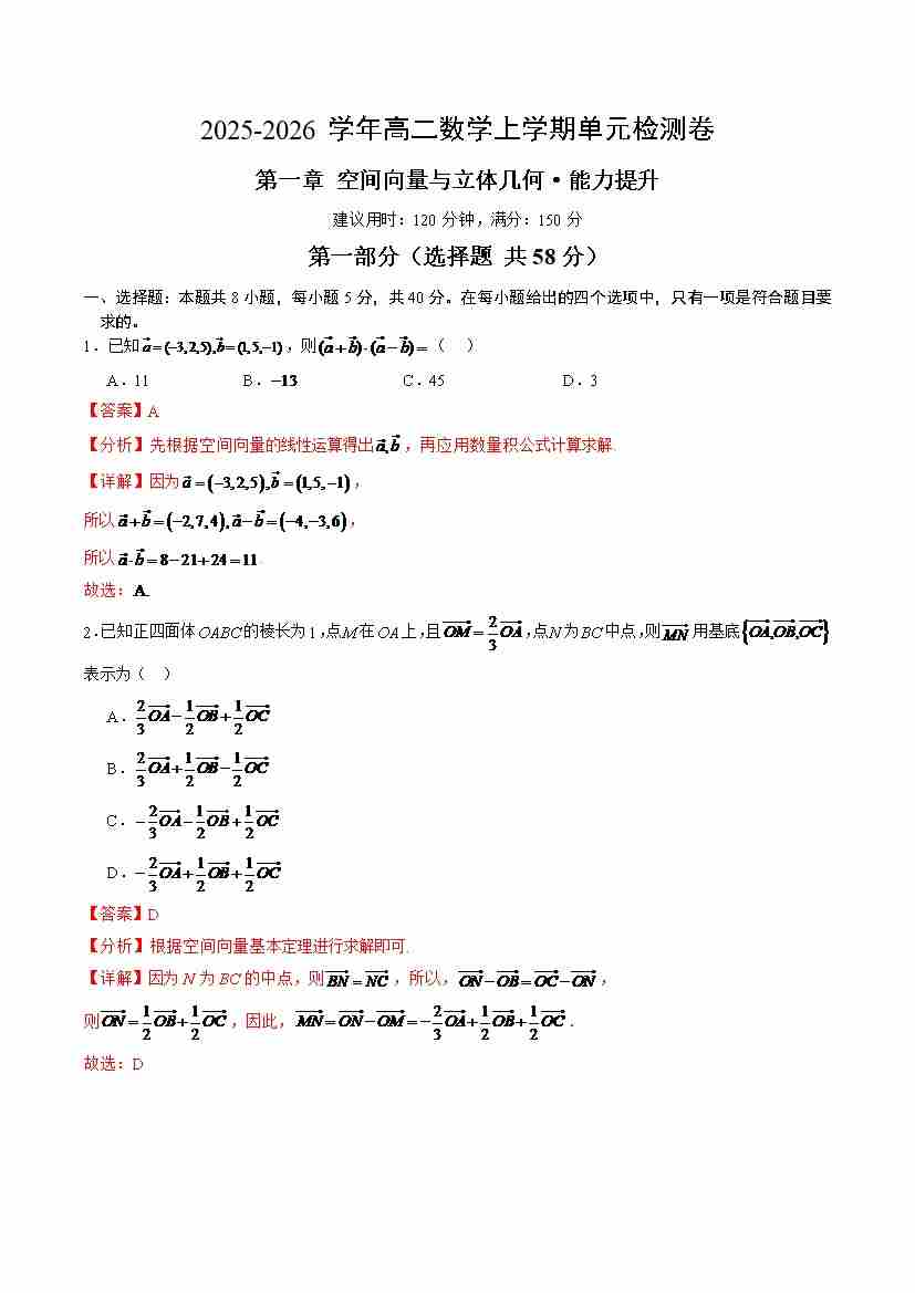 高二数学第一章 空间向量与立体几何测试·提升卷(教师版)