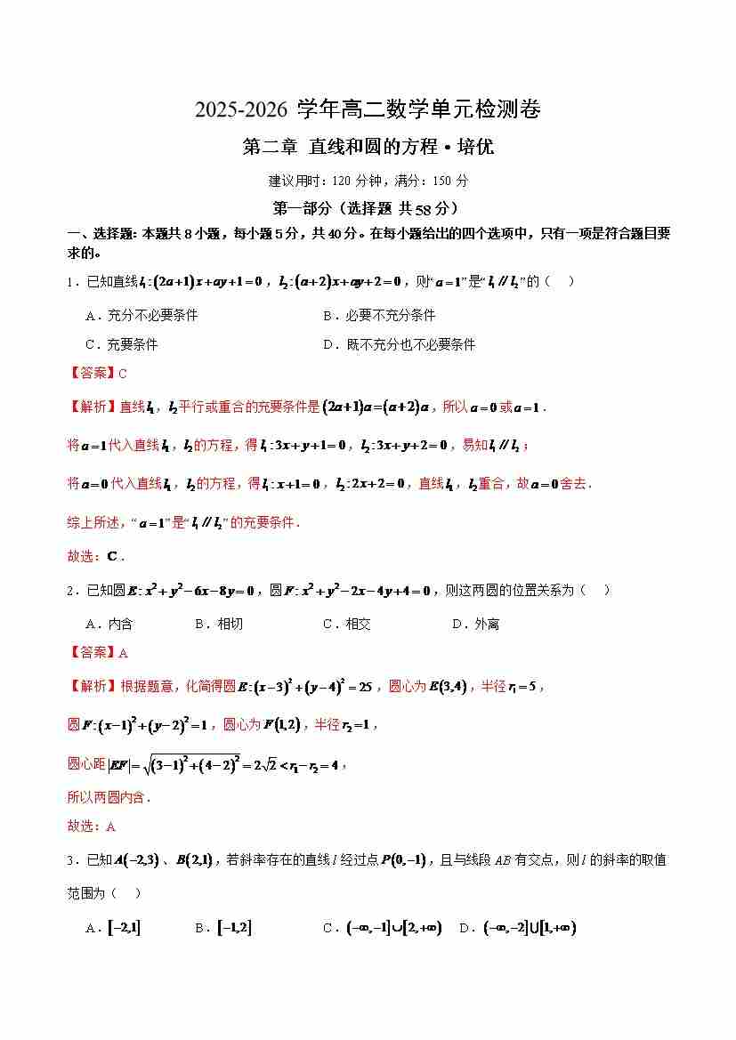 高二上数学第二章 直线和圆的方程·培优卷(教师版)