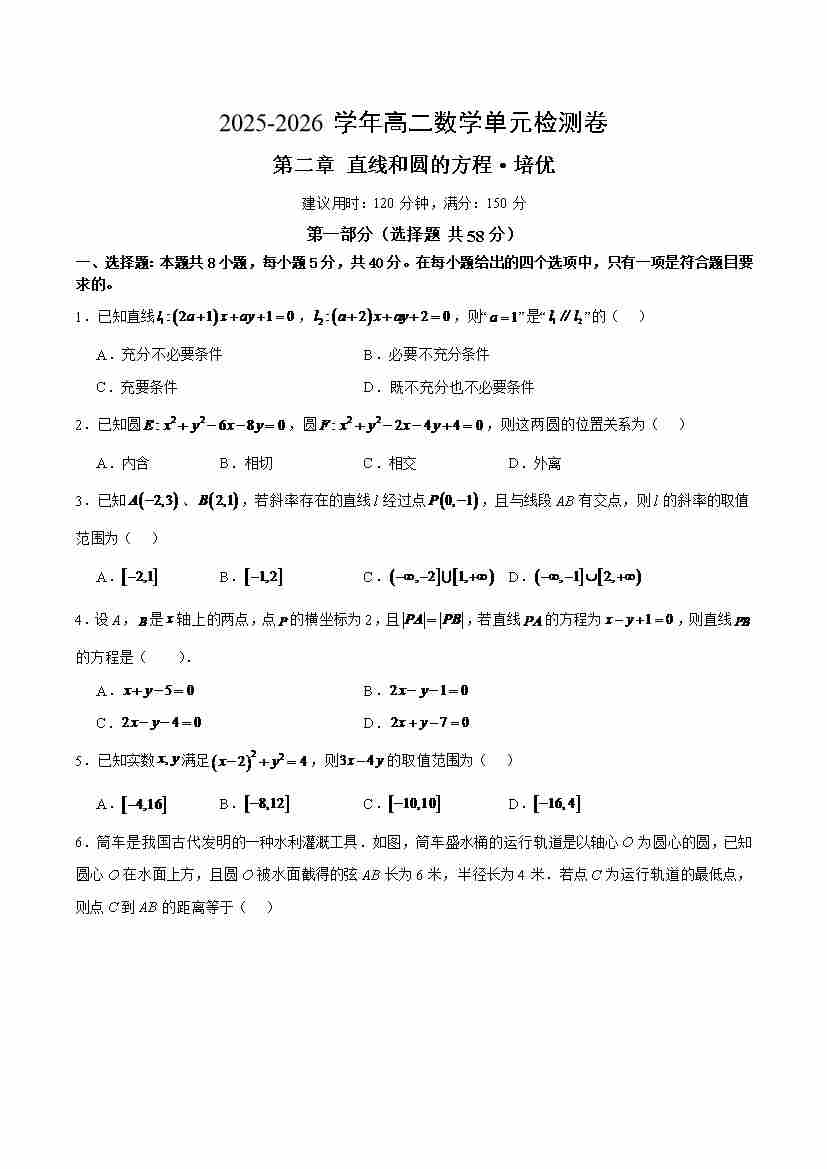 高二上数学第二章 直线和圆的方程·培优卷(考试版A4)