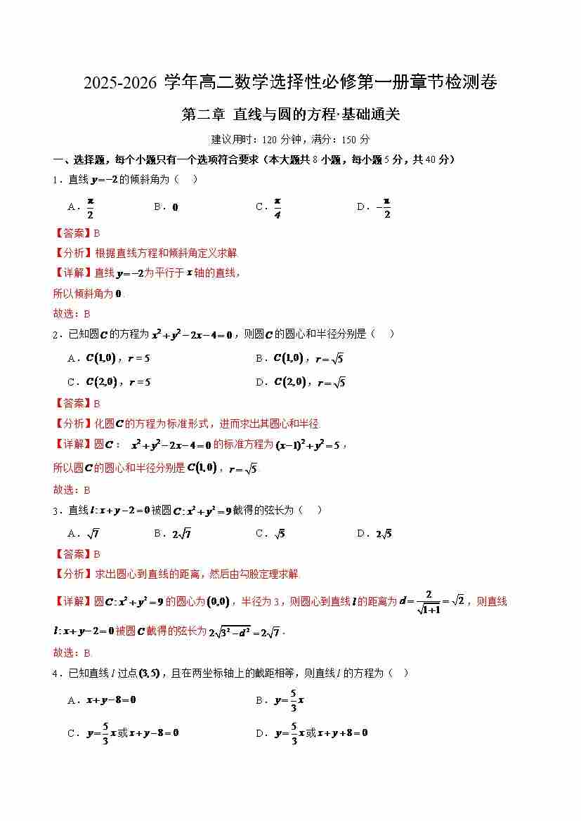 第二章 直线与圆的方程测试·基础卷(教师版)