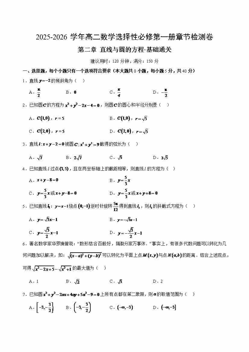 第二章 直线与圆的方程测试·基础卷(考试版A4)