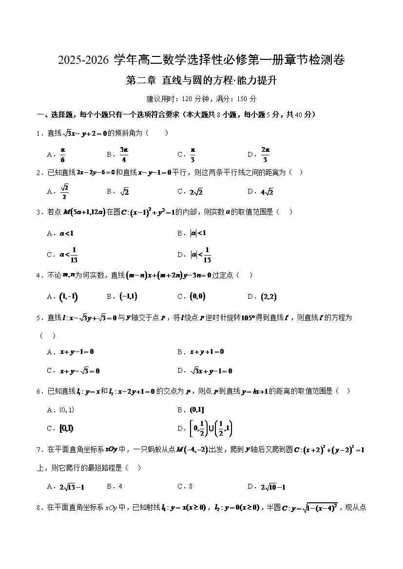 首页 > 全部 > 单元提升卷 > 第二章 直线与圆的方程测试·提升卷(考试版A4)