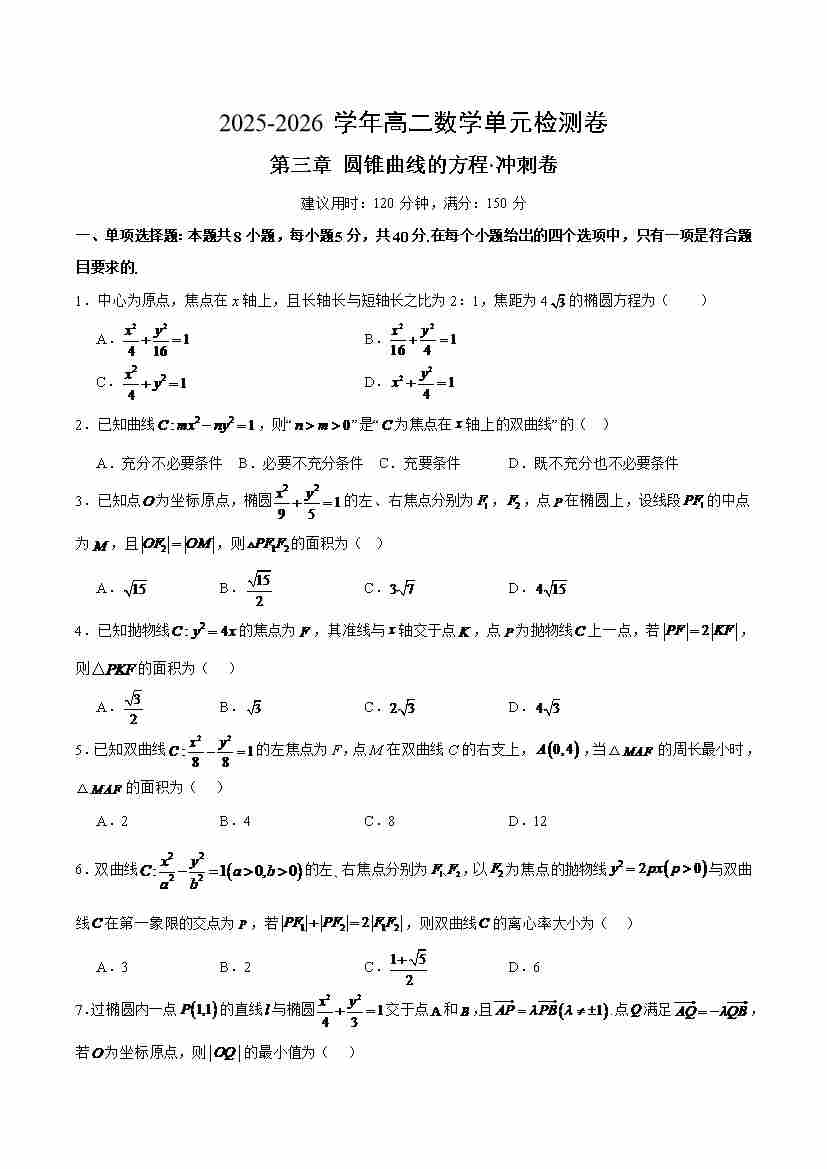 首页 > 全部 > 单元提升卷 > 高二上数学第三章 圆锥曲线的方程测试·冲刺卷(考试版A4)