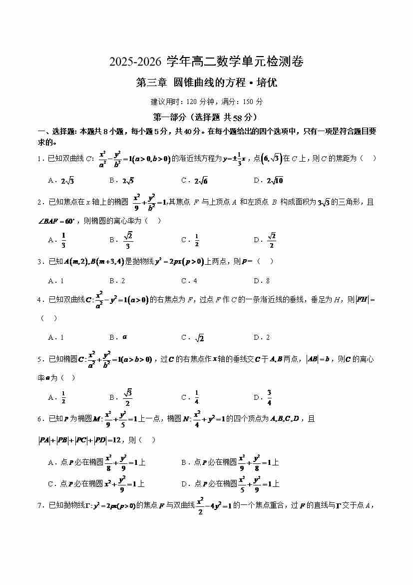 高二上数学第三章 圆锥曲线的方程测试·培优卷(考试版A4)