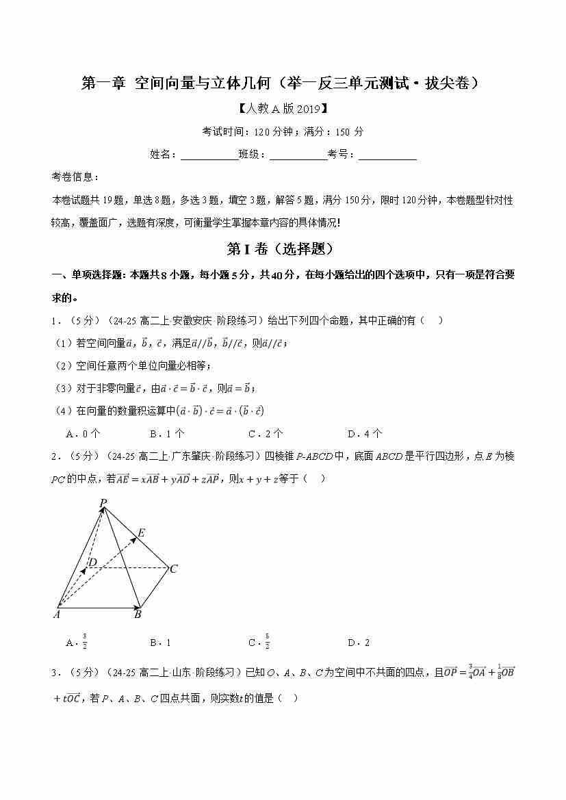 首页 > 全部 > 举一反三 > 第一章 空间向量与立体几何(举一反三单元测试·拔尖卷)(学生版)