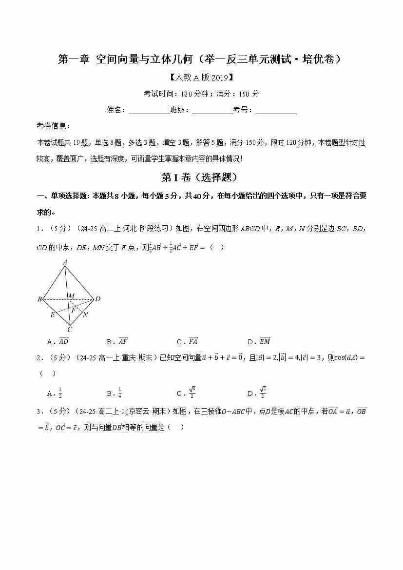 首页 > 全部 > 举一反三 > 第一章 空间向量与立体几何(举一反三单元测试·培优卷)(学生版)