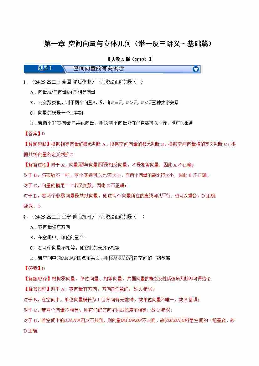 首页 > 全部 > 举一反三 > 第一章 空间向量与立体几何(举一反三讲义·基础篇)(教师版)