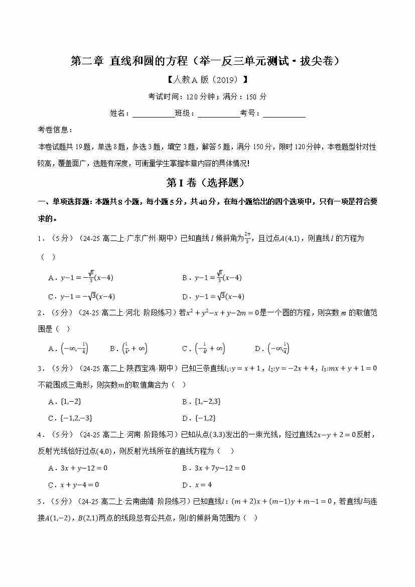 首页 > 全部 > 举一反三 > 第二章 直线和圆的方程(举一反三单元测试·拔尖卷)(学生版)