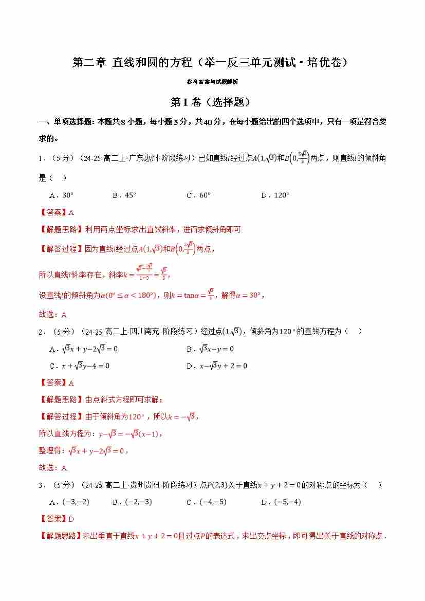 首页 > 全部 > 举一反三 > 第二章 直线和圆的方程(举一反三单元测试·培优卷)(教师版)