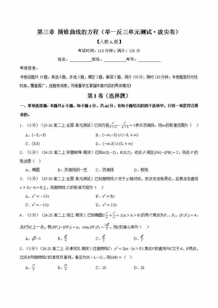 首页 > 全部 > 举一反三 > 第三章 圆锥曲线的方程(举一反三单元测试·拔尖卷)(学生版)