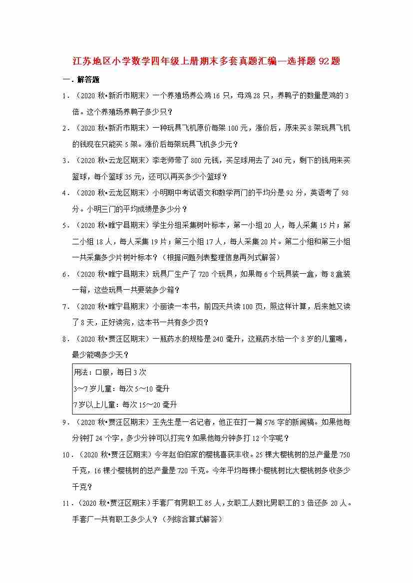 【江苏真题汇编】江苏地区小学数学四年级上册期末多套真题汇编—解答题92题(苏教版,含答案)