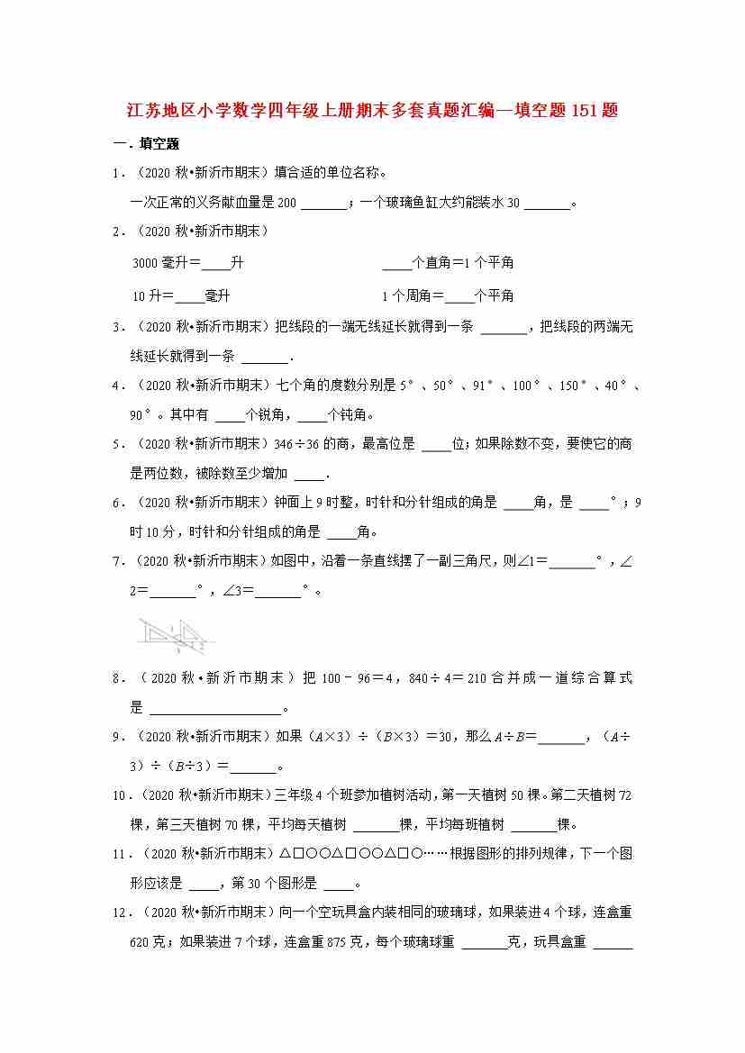 【江苏真题汇编】江苏地区小学数学四年级上册期末多套真题汇编—填空题151题(苏教版,含答案)