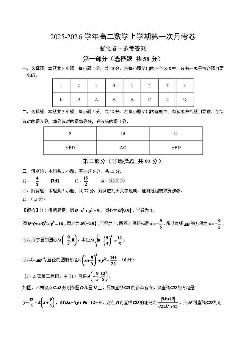 高二数学上学期第一次月考( 高效培优·强化卷)(参考答案)