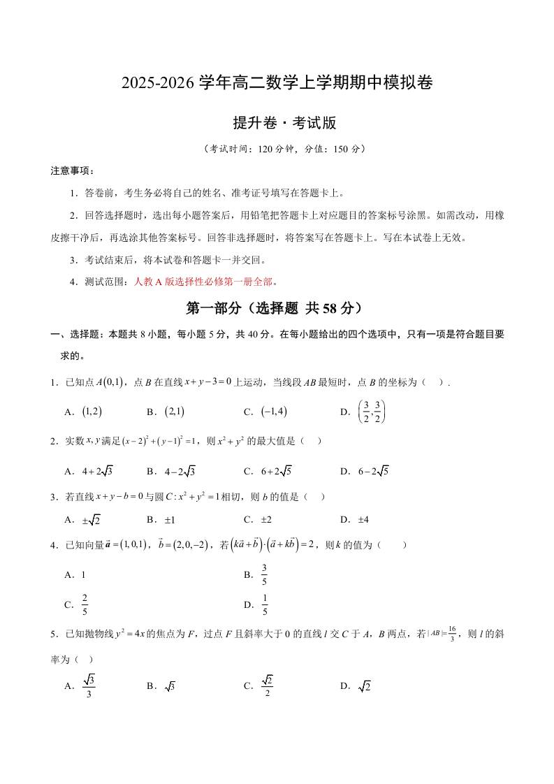 高二数学上学期期中模拟卷(人教A版2019选择性必修第一册全部,高效培优·提升卷)(考试版A4)