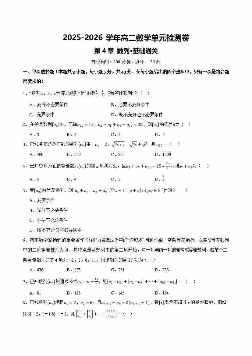 首页 > 全部 > 单元提升卷 > 第四章数列(单元测试·基础卷)(考试版A4)
