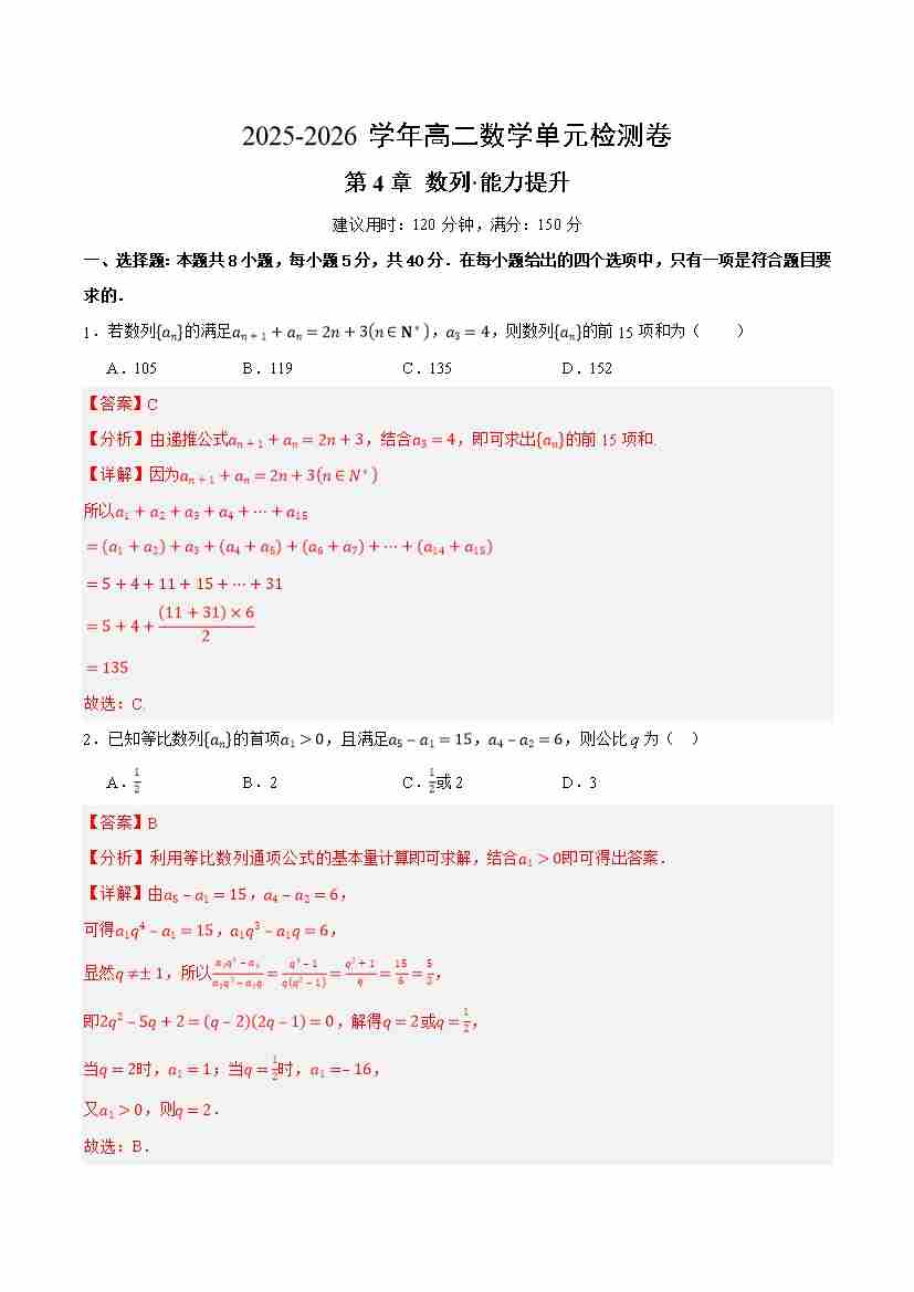 首页 > 全部 > 单元提升卷 > 第四章数列(单元测试·提升卷)(解析版)