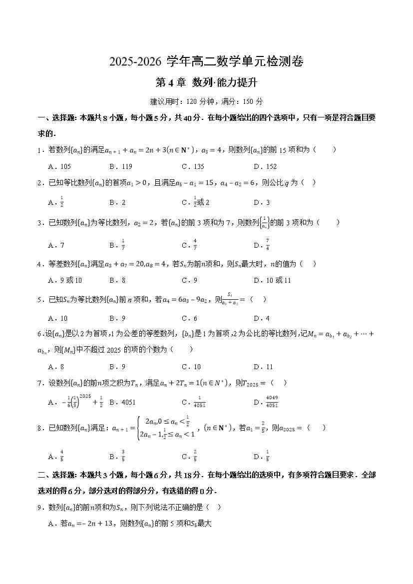 首页 > 全部 > 单元提升卷 > 第四章数列(单元测试·提升卷)(考试版A4)