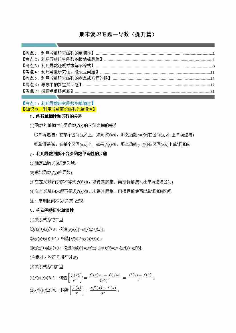期末复习专题— 导数(提升篇)(7大考点)(人教A版2019选择性必修第二册)(学生版)